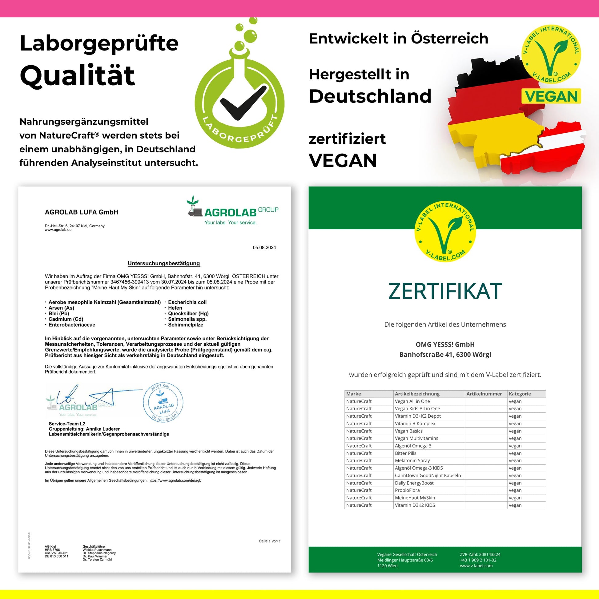 - Die in ÖSTERREICH entwickelte Rezeptur wird nach strengen Qualitätsstandards nach HACCP-Standards in ÖSTERREICH produziert. Jede Charge wird von einem unabhängigen deutschen DIN EN ISO/IEC 17025 zertifizierten Labor fortlaufend geprüft.