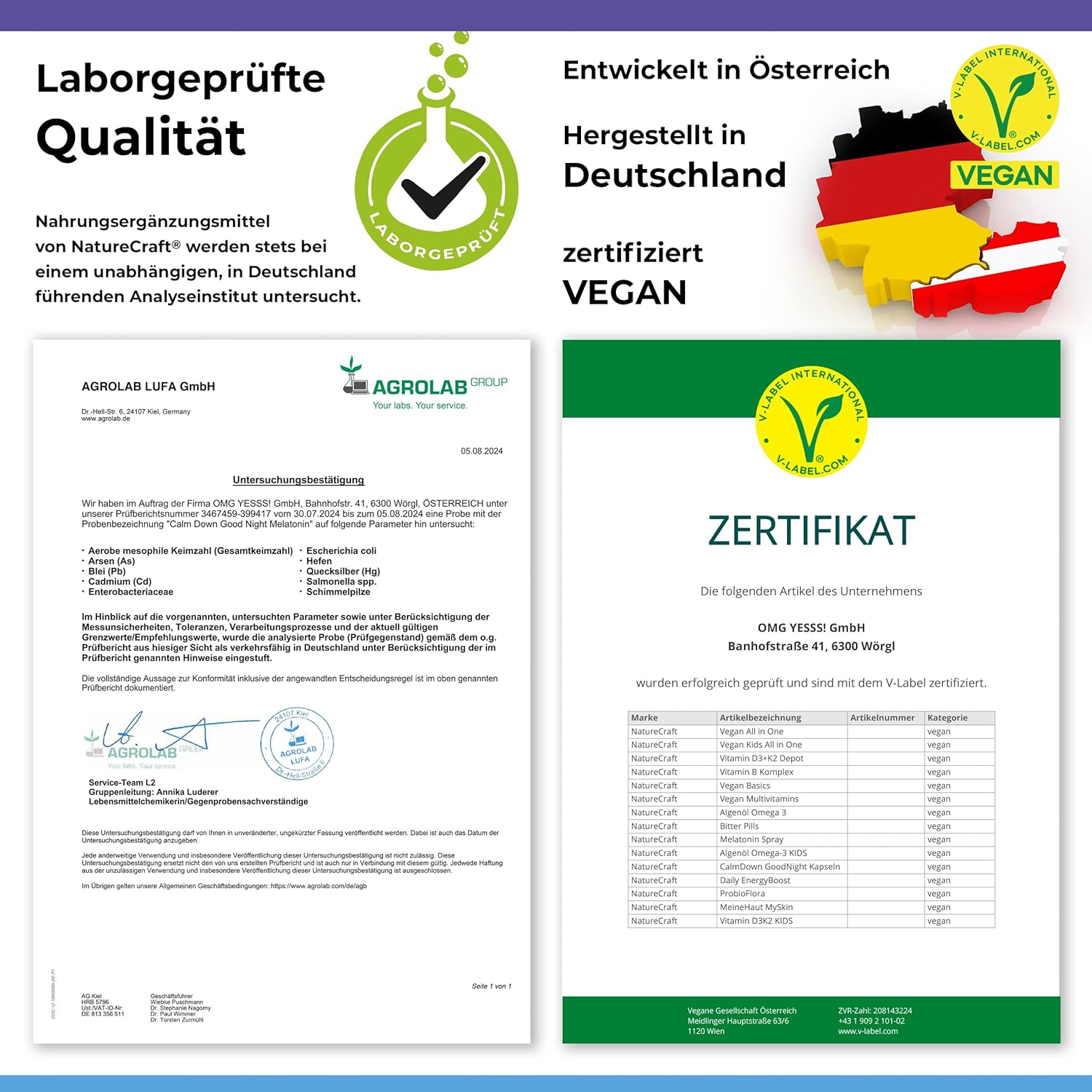- Die in ÖSTERREICH entwickelte Rezeptur wird nach strengen Qualitätsstandards nach HACCP-Standards in ÖSTERREICH produziert. Jede Charge wird von einem unabhängigen deutschen DIN EN ISO/IEC 17025 zertifizierten Labor fortlaufend geprüft.