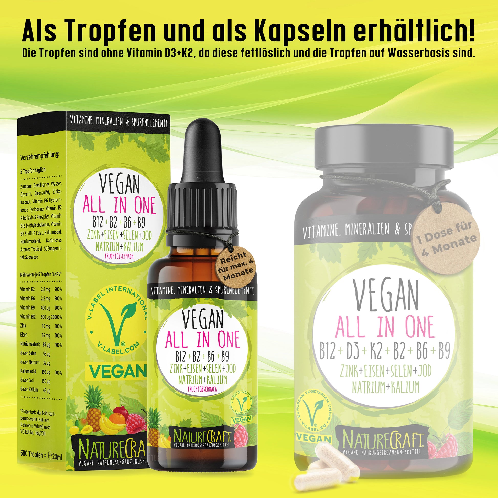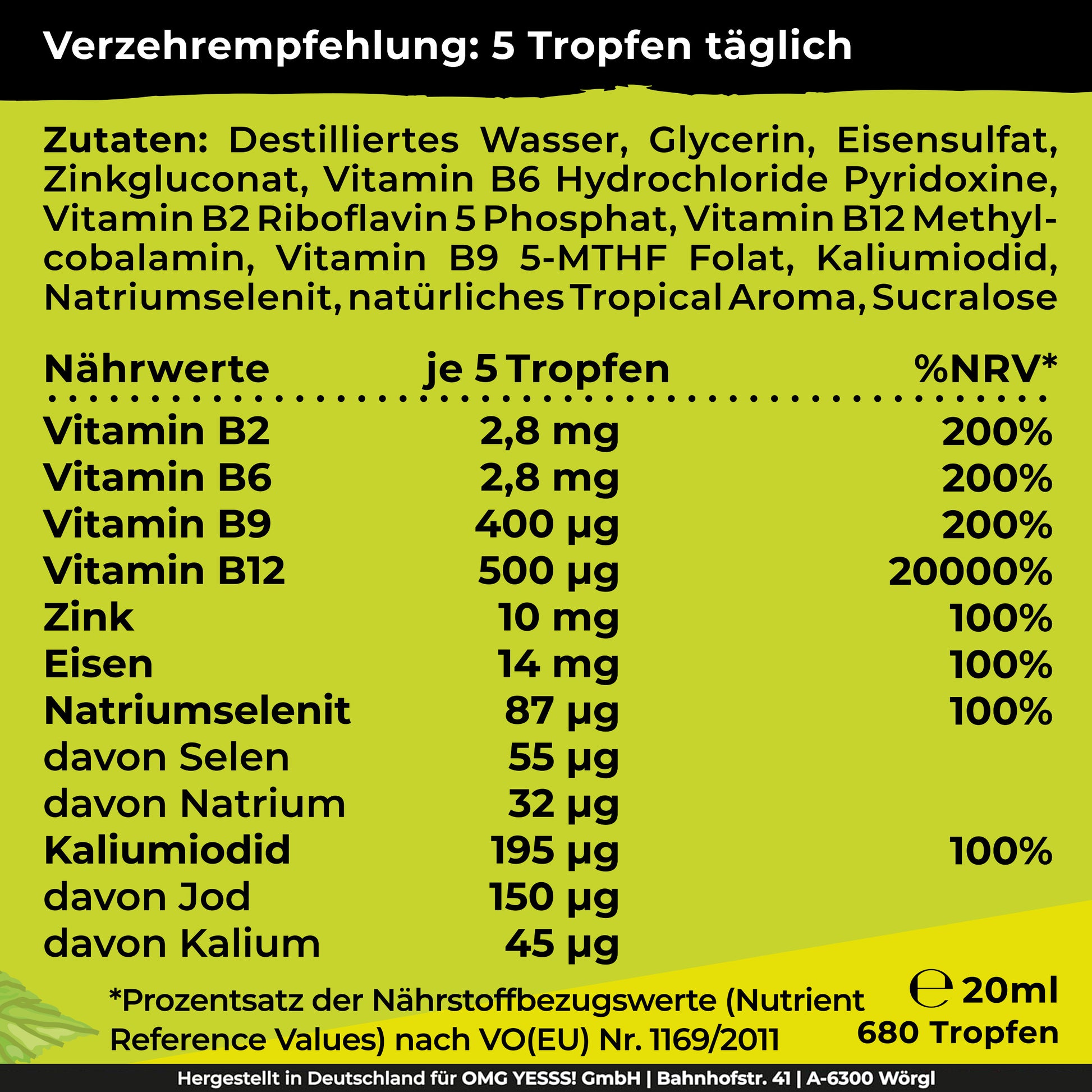 Vegan All-in-One Tropfen - Vitamin B12+B2+B6+B9 Folsäure + Zink + Eisen + Selen + Natrium + Kalium + Jod - Komplex mit natürlichem Tropical Fruchtgeschmack (20ml = ca. 4 Monats-Vorrat)