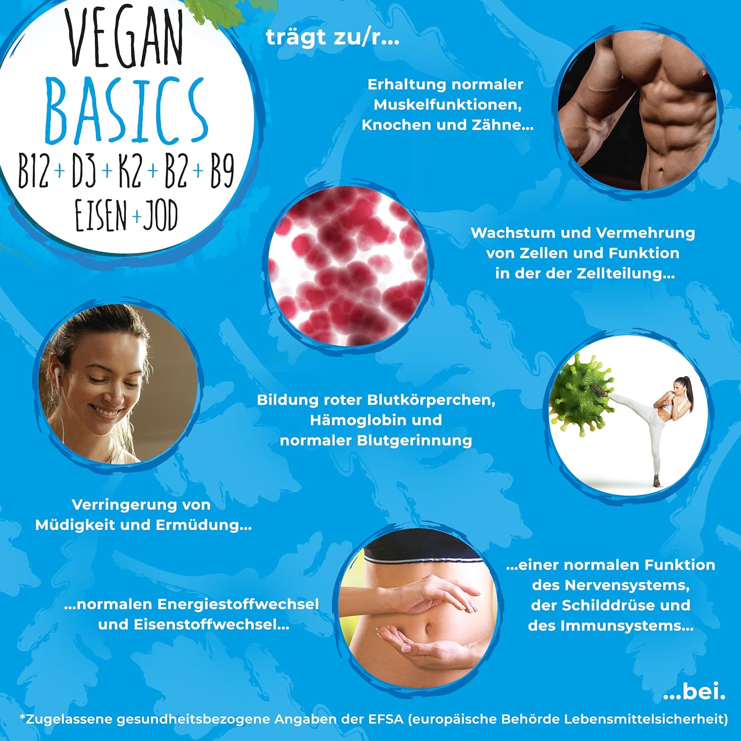 Vegan Basics - Vitamin B12+D3+K2+B2+B9 Folsäure + Eisen + Jod - Komplex mit 120 Kapseln (4 Monats-Vorrat)